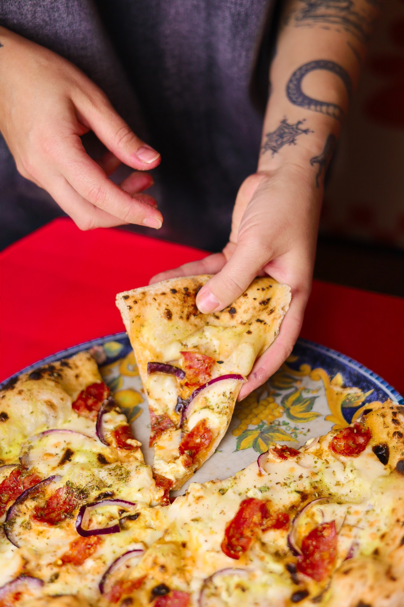 sos pomidorowy, cebulka karmelizowana, portobello, karczochy, rukola, orzeszek ziemny, oliwa czosnkowa, czosnek, oregano bio -